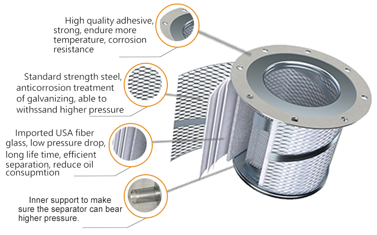 During the compression process in oil-cooled compressors, oil is used to seal, lubricate and cool the air. So some oil is mixed in the air. In order to generate clean air and reduce oil consumption, it is necessary to use an air/oil separator to separate the oil from the air.